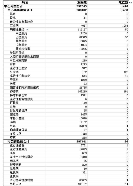 2013年9月全国法定传染病报告发病、死亡统计表 *病毒性肝炎发病数和死亡数分别为甲肝、乙肝、丙肝、戊肝、未分型肝炎报告发病数和死亡数的合计。 **通过传染病网络直报系统报告的死亡数据不作为中国传染病死因顺位的依据。 (云南省健康教育所 2013.10.29 转载) |